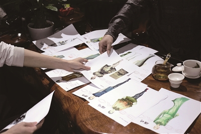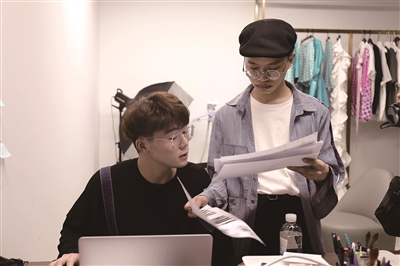 5月26日,WAREBORN伊夫服装工作室的设计师牟珍贵(右)和杨峰(左)在讨论时尚周相关设计图纸。