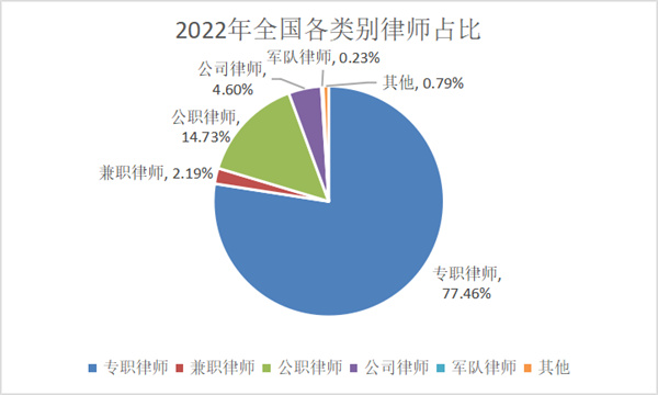 从律师类别看,专职律师50.47万多人,占77.46%,兼职律师1.43万多人,占2.19%,公职律师9.59万多人,占14.73%,公司律师2.99万多人,占4.6%,军队律师1500多人,占0.23%。