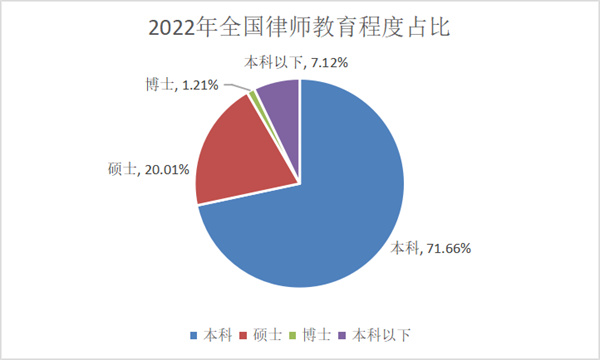从文化程度看,本科学历的律师46.69万多人,占71.66%,硕士研究生学历的律师13.04万多人,占20.01%,博士研究生学历的律师7800多人,占1.21%,本科学历以下的律师4.64万多人,占7.12%。